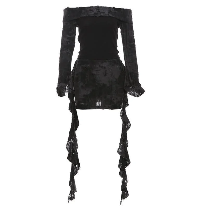 snowdoves-TM --Off shoulder long flared sleeve ribbed mini skirt set