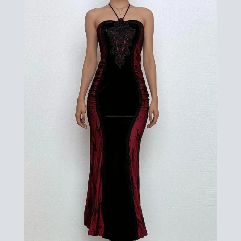 snowdoves-TM --Halter embroidery ruched contrast maxi dress