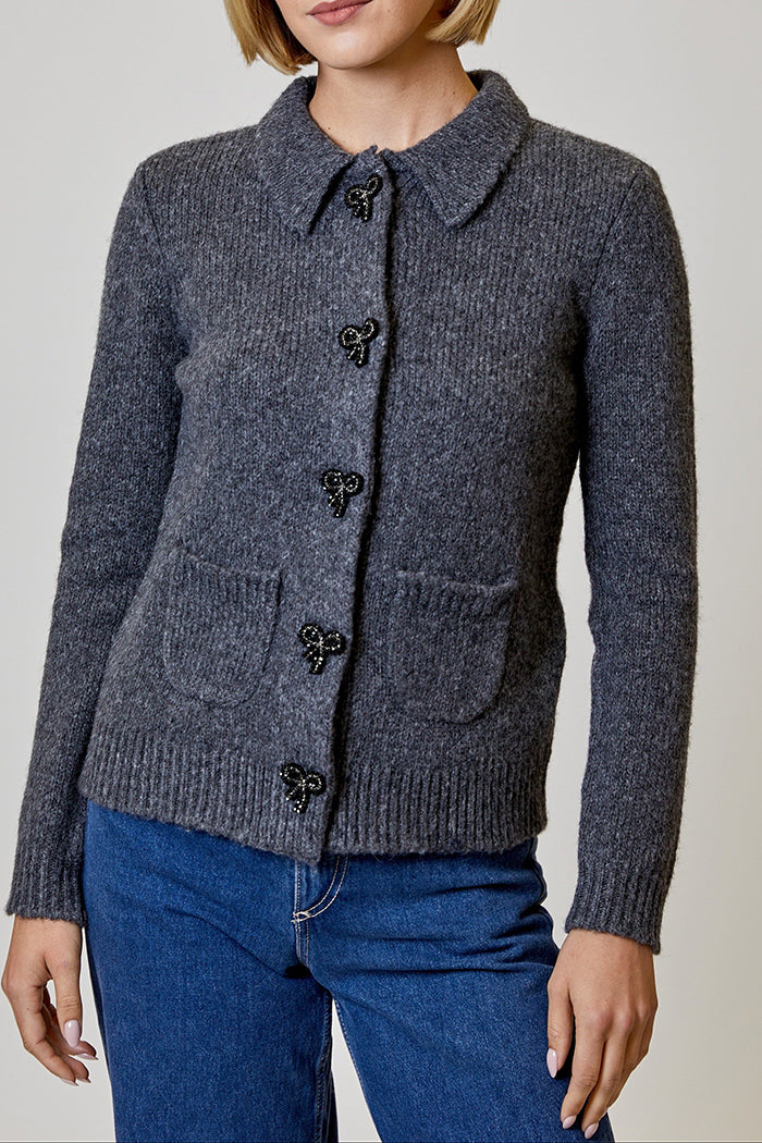 Knit Collared Bow-Button Pocket Cardigan