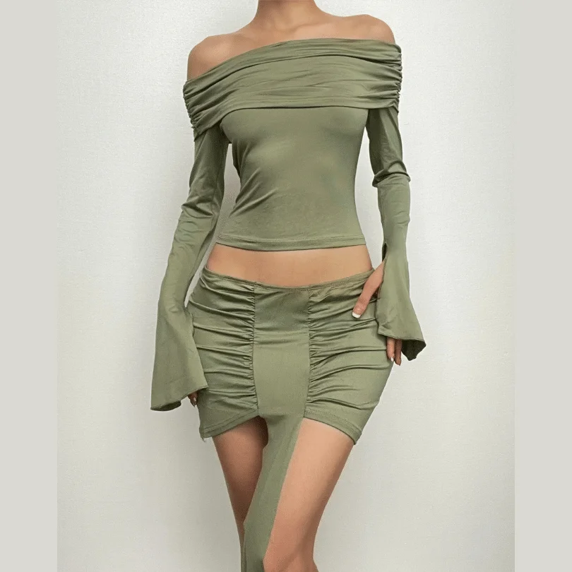snowdoves-TM --Ruched off shoulder long sleeve solid ribbon mini dress